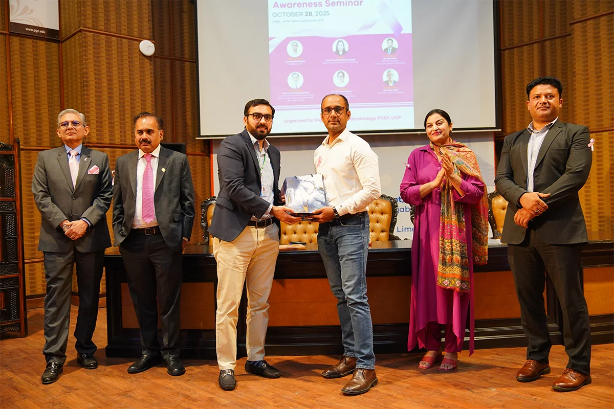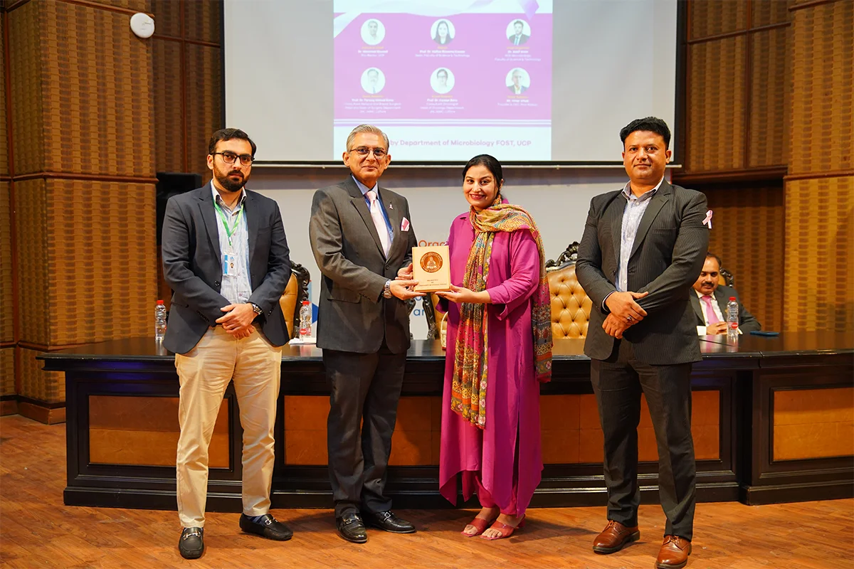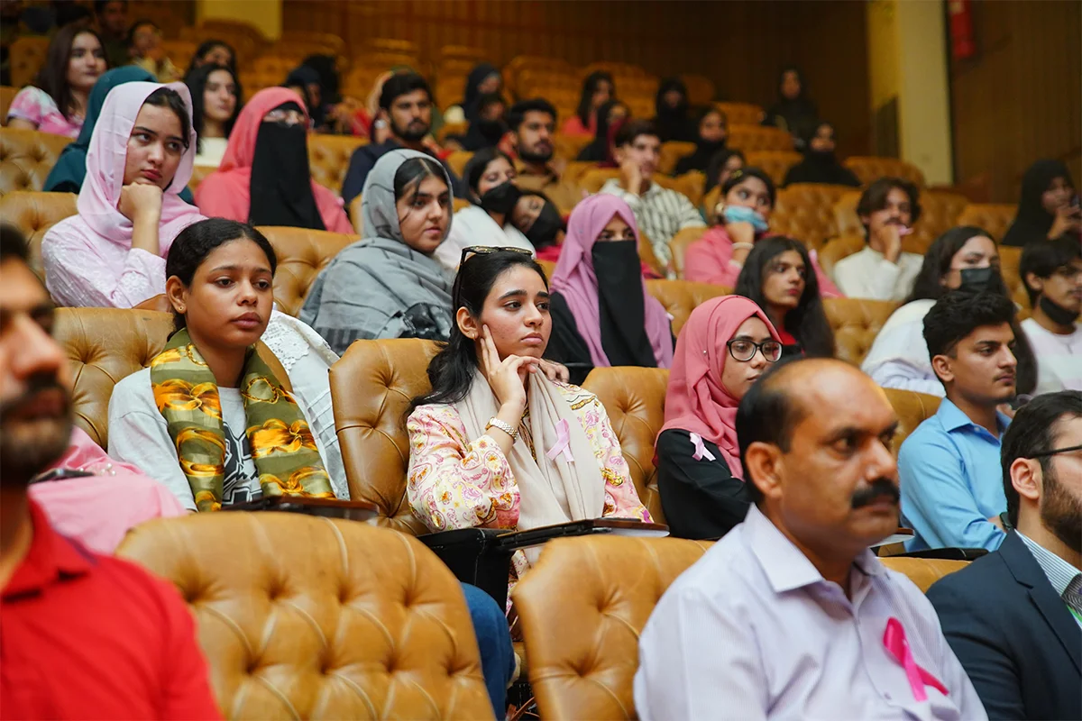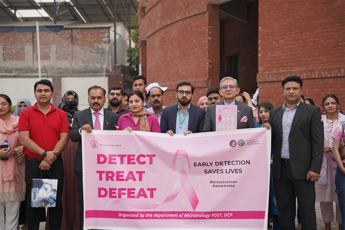 Department of Microbiology, in collaboration with the Human Resource Department, organized a Breast Cancer Awareness Seminar, in partnership with Al Nasar Lab and Pink Ribbon Pakistan. The event featured esteemed speakers including Mr. Omer Aftab (CEO, Pink Ribbon Pakistan), Prof. Dr. Farooq Ahmed Rana (Consultant Surgeon, Jinnah Hospital Lahore), and Prof. Dr. Kausar Bano (Consultant Oncologist, JHL/AIMC Lahore), who shared valuable insights on early detection, treatment, and preventive strategies. Dr. Aatif Amin, Head of the Department of Microbiology, welcomed the guests and emphasized the importance of awareness and timely diagnosis, while the Dean expressed gratitude to the speakers and praised the initiative. The guests appreciated the efforts of organizers Ms. Iqra Jamil and Mr. M. Tahir Ishaq for successfully arranging the seminar, which concluded with an awareness walk symbolizing collective commitment to the fight against breast cancer.