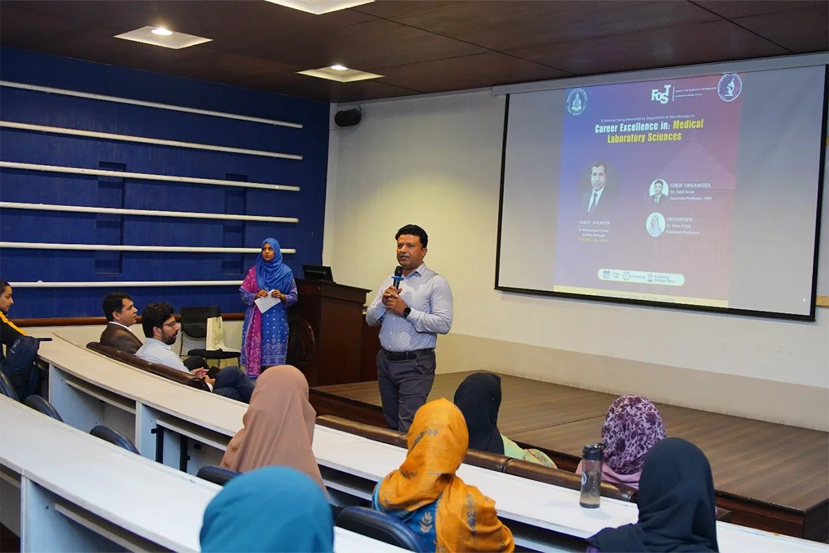 Department of Microbiology conducted an engaging seminar on Career Excellence in Medical Laboratory Sciences for the MLT Fall 2025 batch, featuring an in-depth talk by Dr. Muhammad Sohail, Quality Manager at Chughtai Lab, Lahore. Under the leadership of Dr. Aatif Amin and Dr. Saba Kabir, students received comprehensive guidance on career pathways, industry expectations, quality standards, and professional growth in Medical Laboratory Sciences.