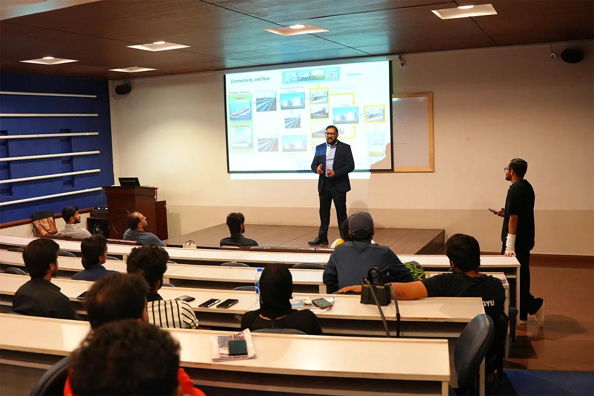 Business School, in collaboration with the Supply Chain Club, successfully organized a Guest Speaker Session titled “Fueling Retail Success: Insights from Retail Supply Chain Strategies of PSO”. Mr. Ali Abbas, Regional Head Business Partner at Pakistan State Oil (PSO), shared valuable insights into PSO’s innovative supply chain strategies and operational excellence. The session provided students and faculty with a practical understanding of how effective supply chain management drives retail success in Pakistan’s energy sector.
