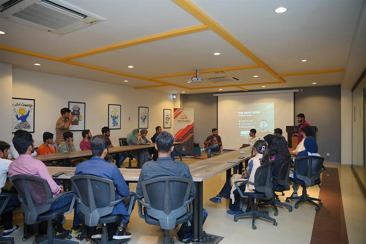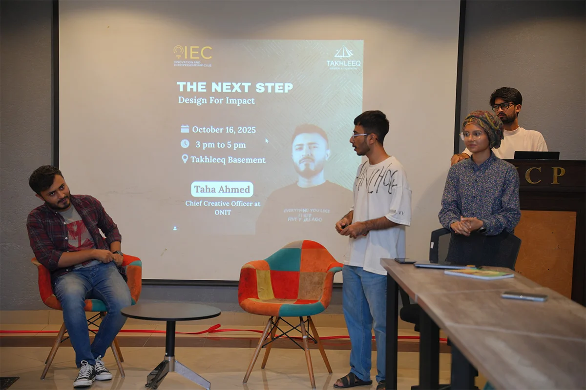 The Innovation and Entrepreneurship Club organized an insightful session titled “The Next Step: Design for Impact” featuring Taha Ahmed, Chief Creative Officer at ONIT. During the session, he shared his journey of transforming ideas into a successful venture, emphasizing that consistent effort often surpasses innate talent. He discussed the essence of design as a process of learning, experimenting, and creative expression beyond technical skill. Showcasing his portfolio, he highlighted the importance of visuals, words, and aesthetics in crafting impactful messages. The session concluded with an engaging Q&A, motivating students to embrace creativity, pursue entrepreneurship, and take bold steps toward their professional goals.