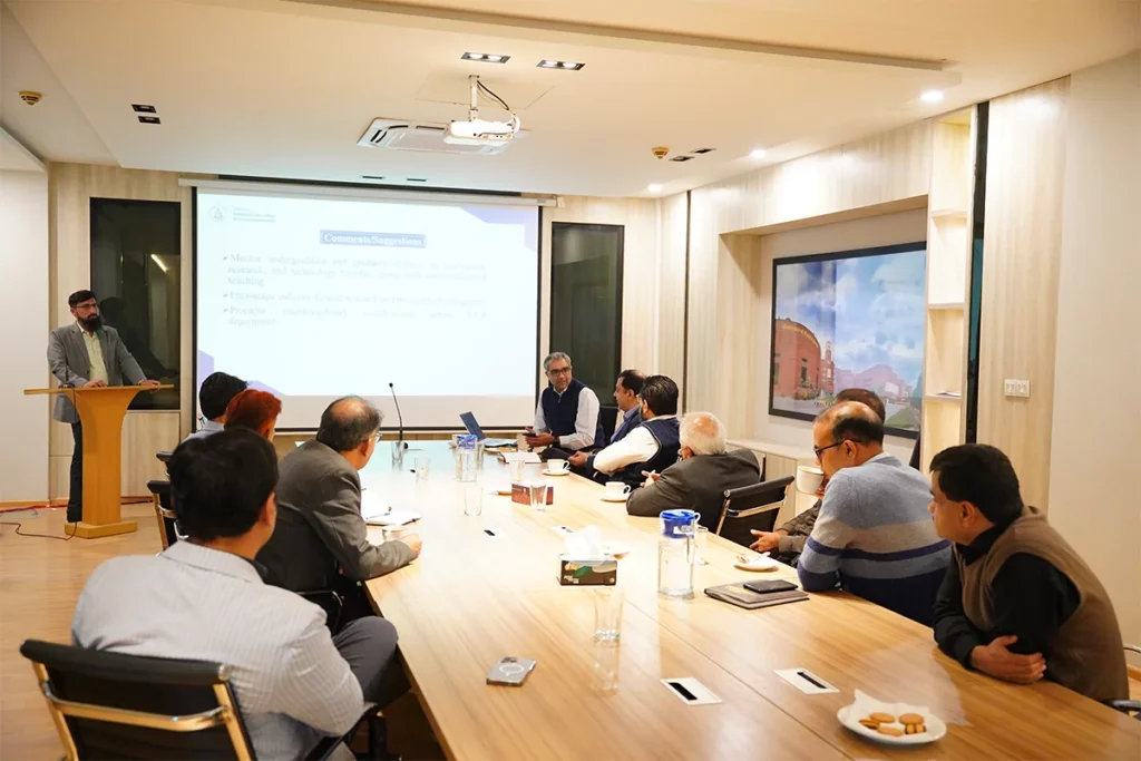 The Office of Research, Innovation & Commercialization, organized a strategic meeting of the E3S–FOE Interdisciplinary Research Group, aimed at strengthening collaborative research and advancing commercialization pathways. The session, led by Dr. Hammad Naveed and Prof. Dr. Muhammad Akhyar Farrukh, highlighted strategies to translate research outcomes into societal and industrial impact. Dr. Ali Ahmad (Group Leader) and his team presented the group’s objectives.