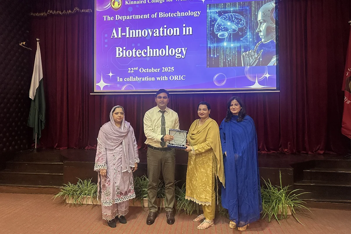 Prof. Dr. Muhammad Naveed delivered an invited talk at Kinnaird College University, Lahore, during a seminar titled “Artificial Intelligence in Biotechnology: Transforming the Future of Life Sciences.” In his insightful session, he highlighted the growing impact of AI in genomics, drug discovery, precision medicine, and computational biology, emphasizing how these innovations are shaping the future of life sciences. The seminar, organized by the Department of Biotechnology at Kinnaird College, also addressed key discussions on ethical considerations, data challenges, and the potential of AI applications within Pakistan’s biotech sector. The session was highly informative and received strong appreciation from both students and faculty.