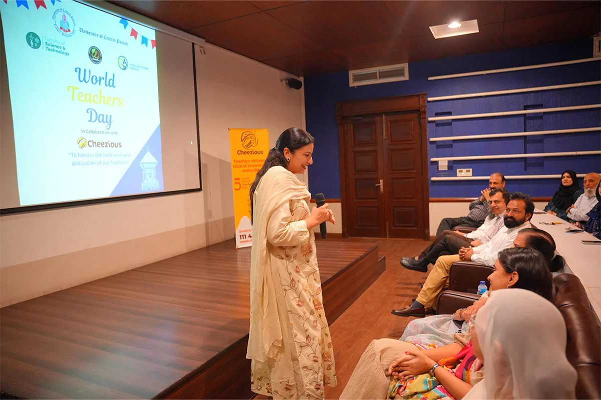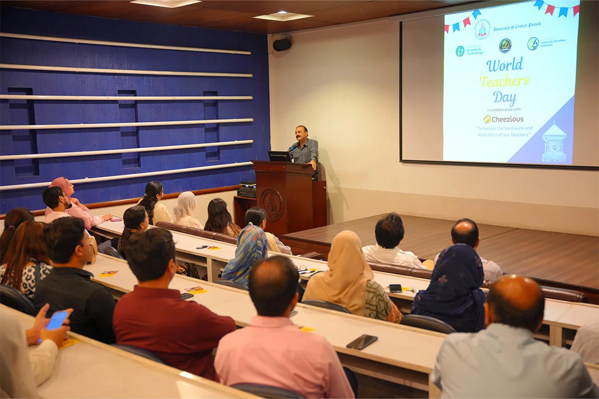 Department of Food & Nutritional Sciences and the Food Junction Society, in collaboration with Cheezious, celebrated World Teachers’ Day. The event served as a heartfelt tribute to UCP’s dedicated faculty members, recognizing their invaluable role in shaping academic excellence and inspiring future leaders. Faculty were honored with thoughtful tokens of appreciation and messages of gratitude, reflecting the university’s deep respect for their commitment to education and mentorship. Special thanks were extended to Cheezious for their generous collaboration in making the celebration a memorable occasion.
